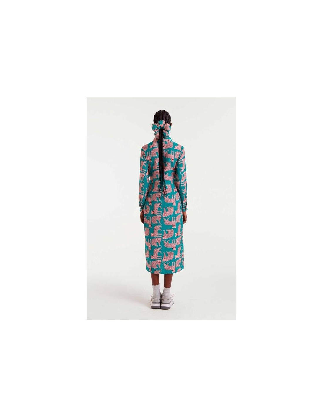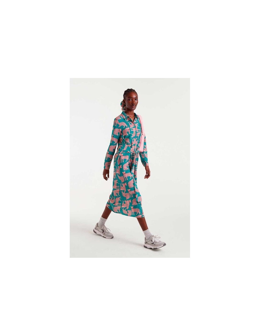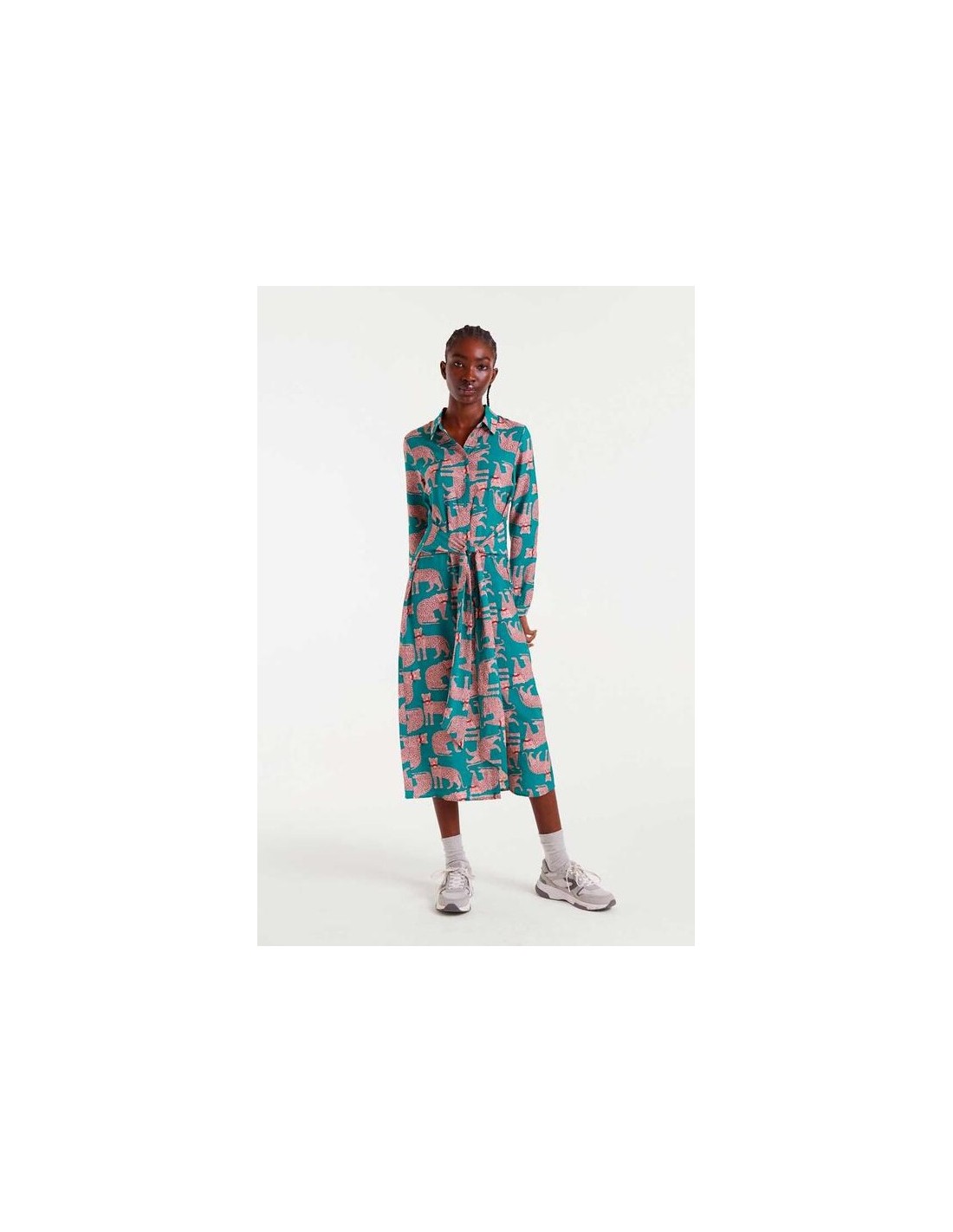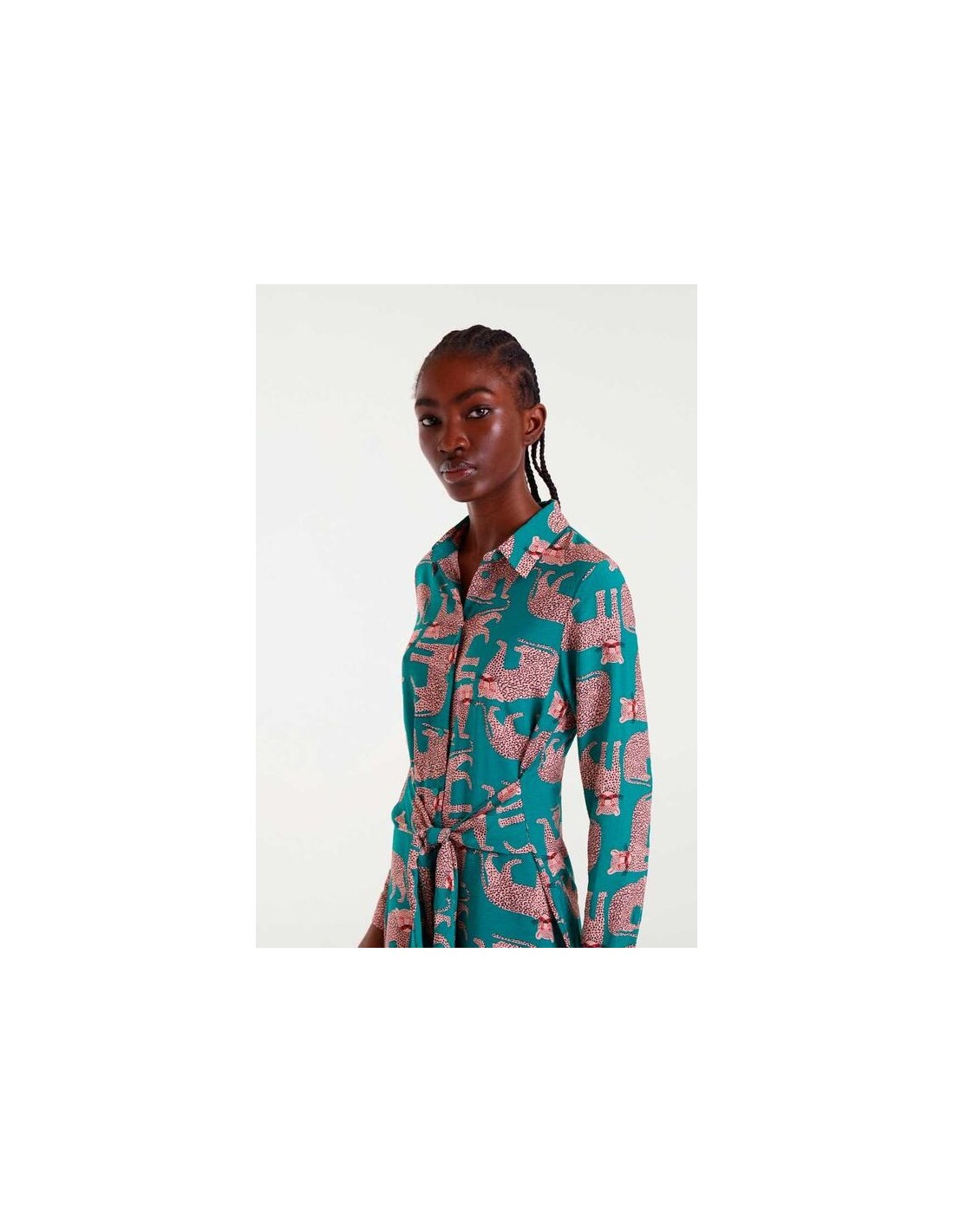 Vestido midi de tejido crepé ligero con estampado Onca. Cuello con solapa y manga larga terminada en puño con botón. Cierre frontal con botones y cintura lazada.