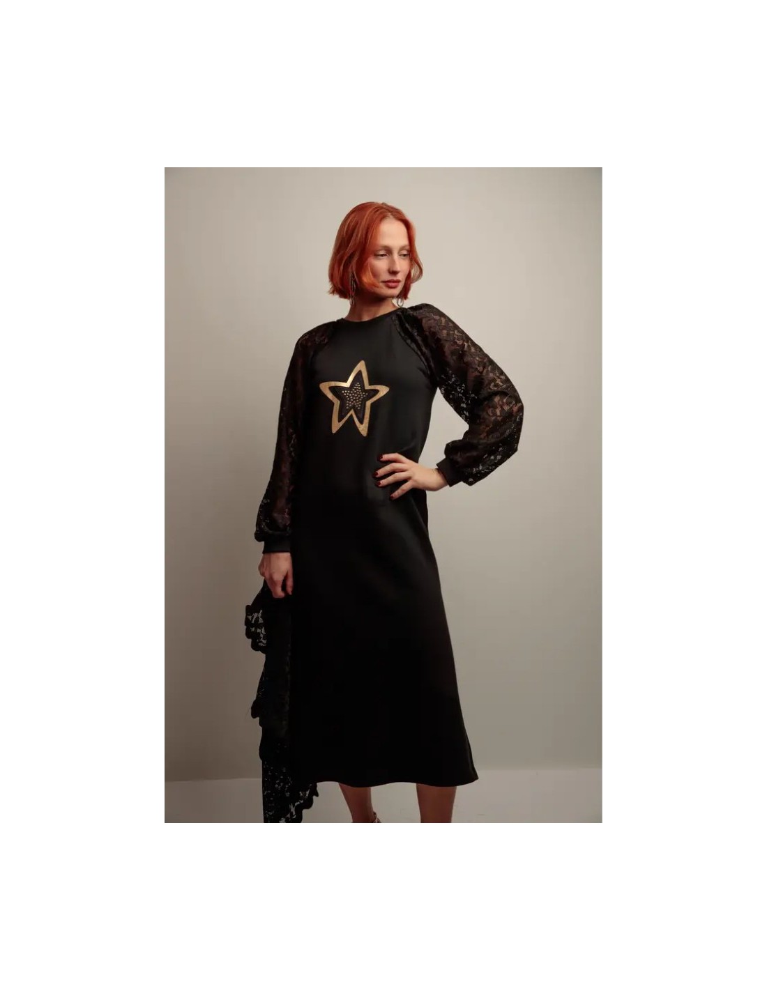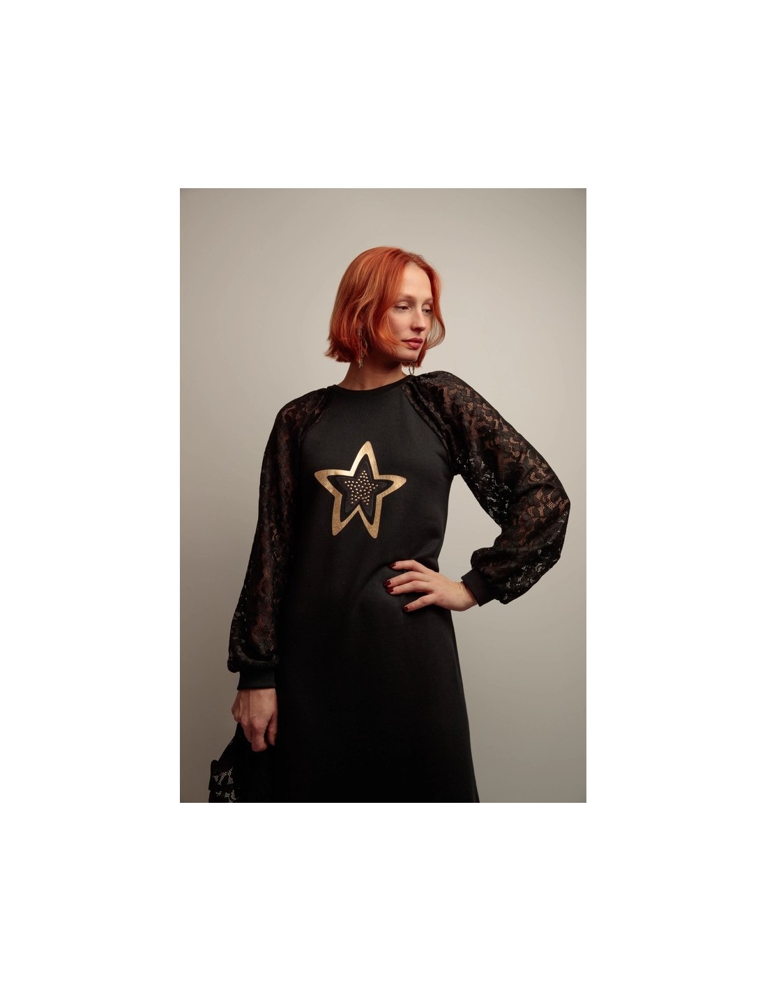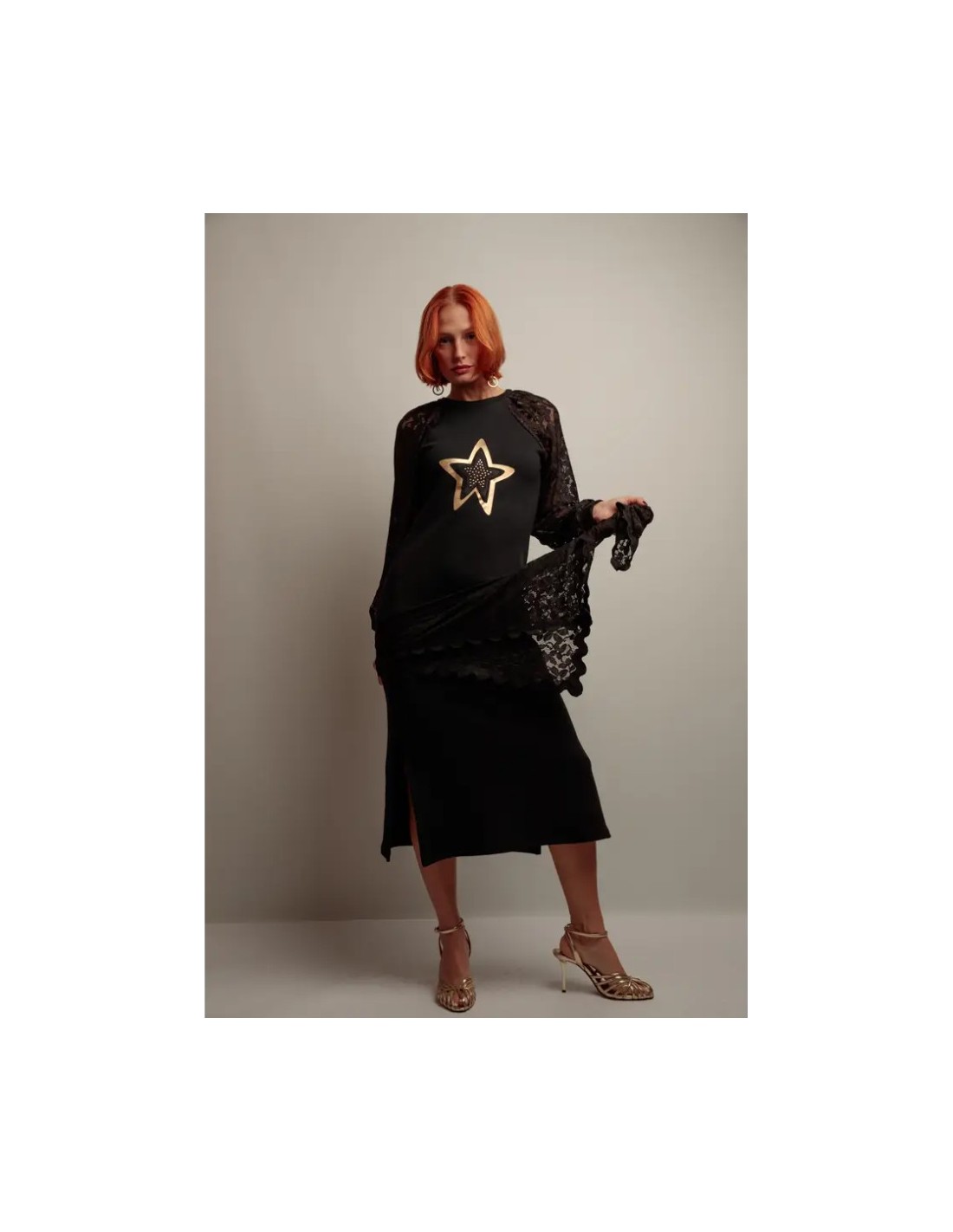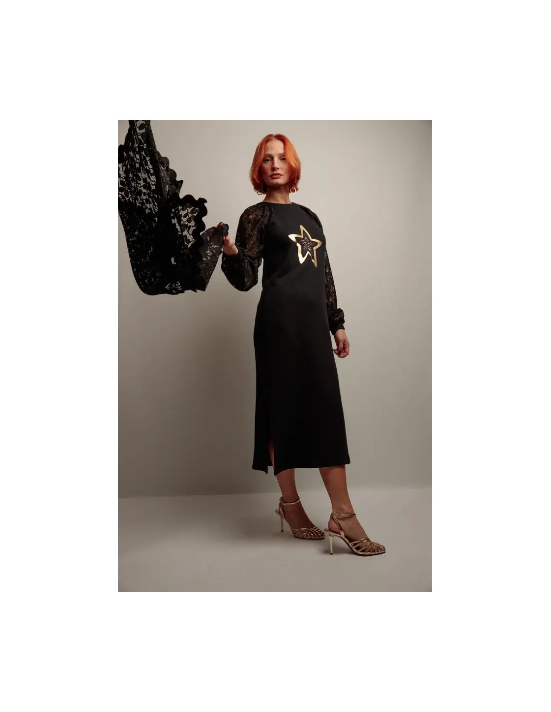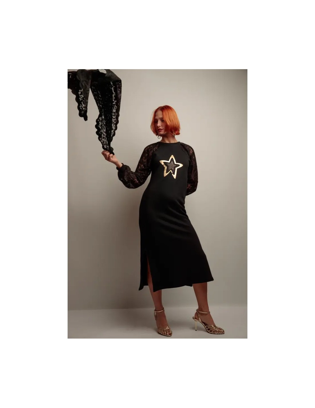 VESTIDO GRETA PARCHE STAR Vestido largo de mujer con corte recto, aberturas laterales y manga larga corte ranglam confeccionadas en hilatura de encaje. El cuerpo del vestido está confeccionado en tejido de punto en color negro. Diseño frontal de parche con lentejuelas doradas. Confeccionado en Vigo.