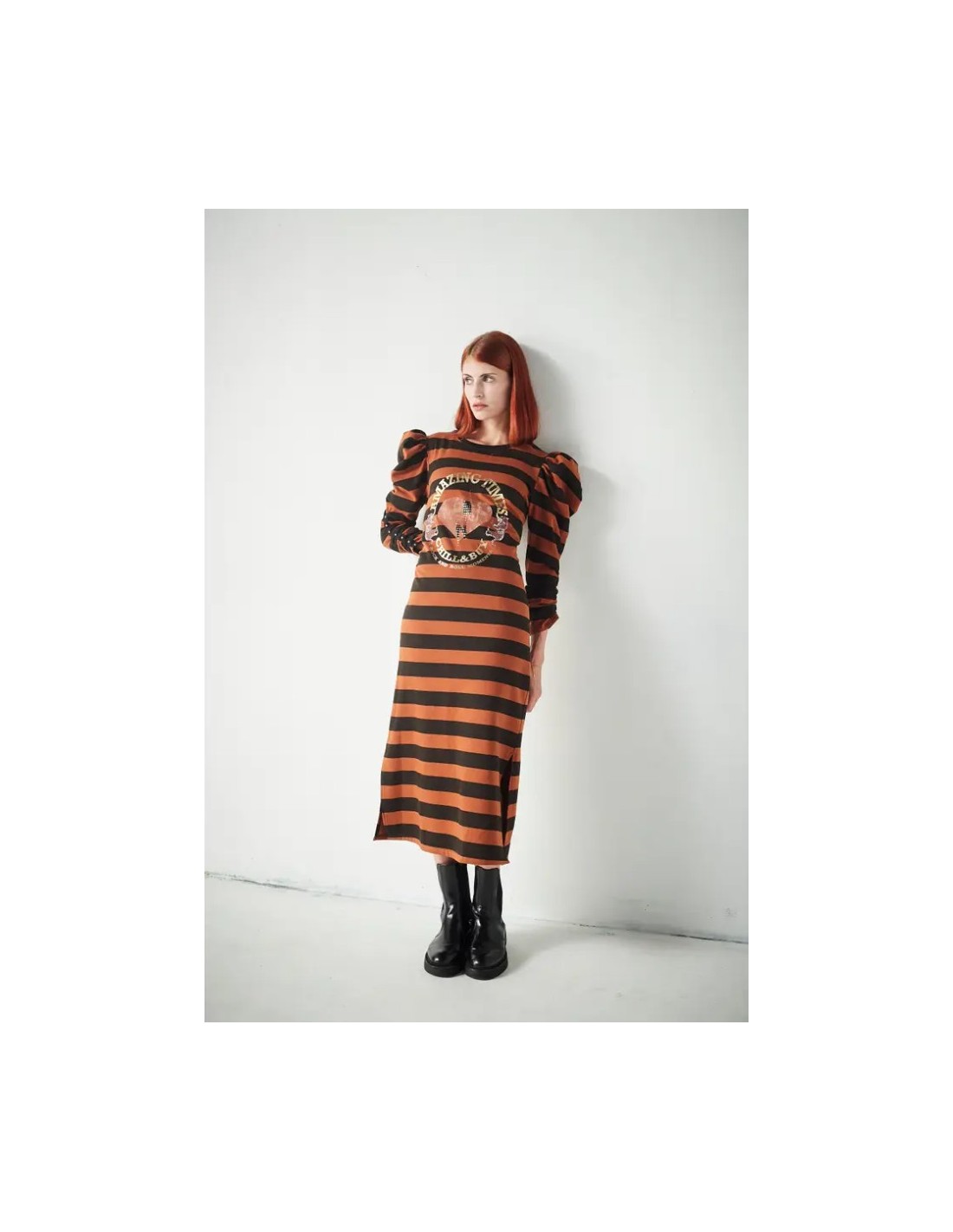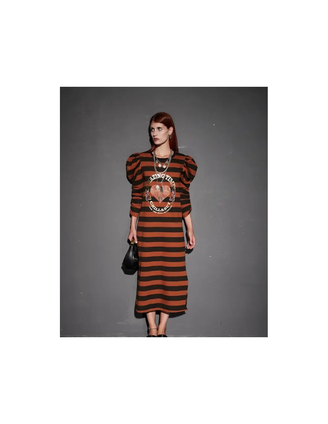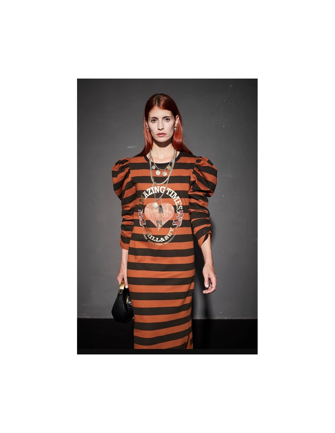Vestido Largo Rayas Amazing???? Vestido largo en tejido de rayas en color castaño y negro, con cuello redondo y aberturas laterales. Un diseño cómodo y cómodo con detalles que marcan la diferencia. ??Confeccionado en tejido de rayas en tonos castaño y negro. ??Corte largo con aberturas laterales que aportan fluidez y movimiento. ???Cuello redondo clásico, versátil y fácil de combinar. ?Manga larga abullonada que suma volumen y estilo. ??Detalle de tachuelas en el puño que aporta un acabado distintivo. ?? Estampación frontal que completa el diseño.