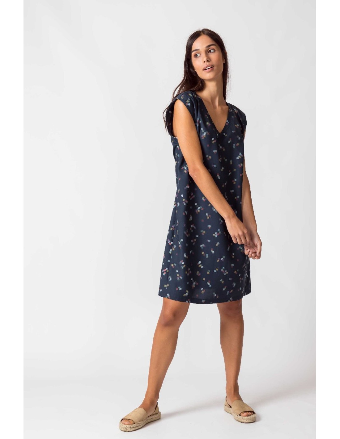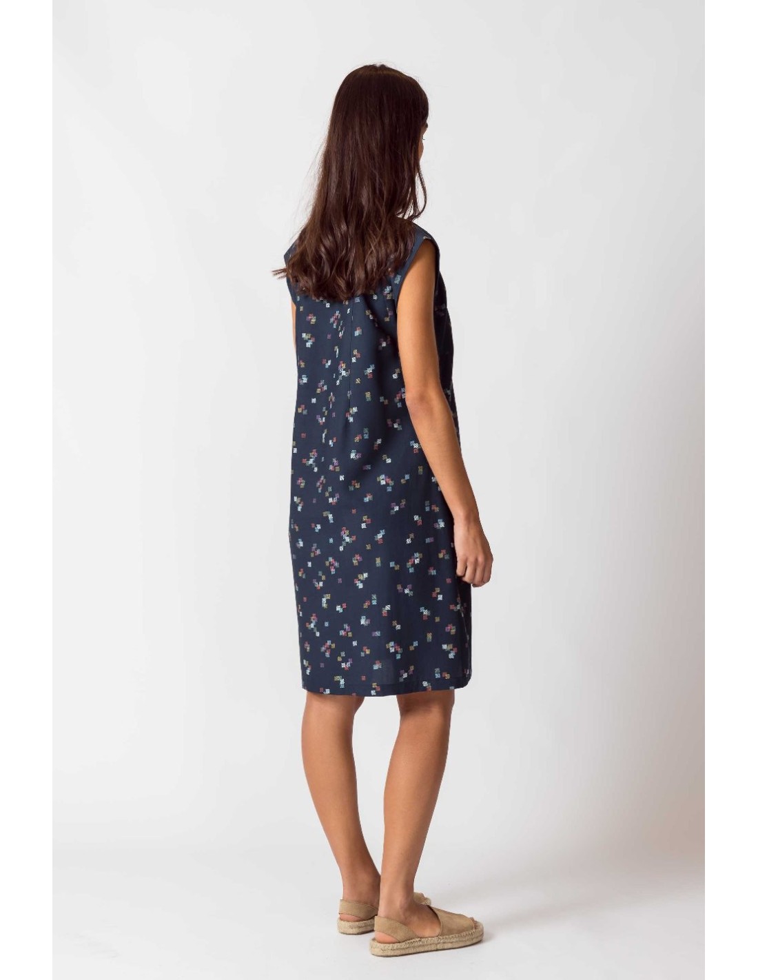 Vestido de manga corta con un colorido patrón cuadrado y formas cómodas. Un vestido perfecto para los días de mucho trabajo y para usarlo sin importar la ocasión.