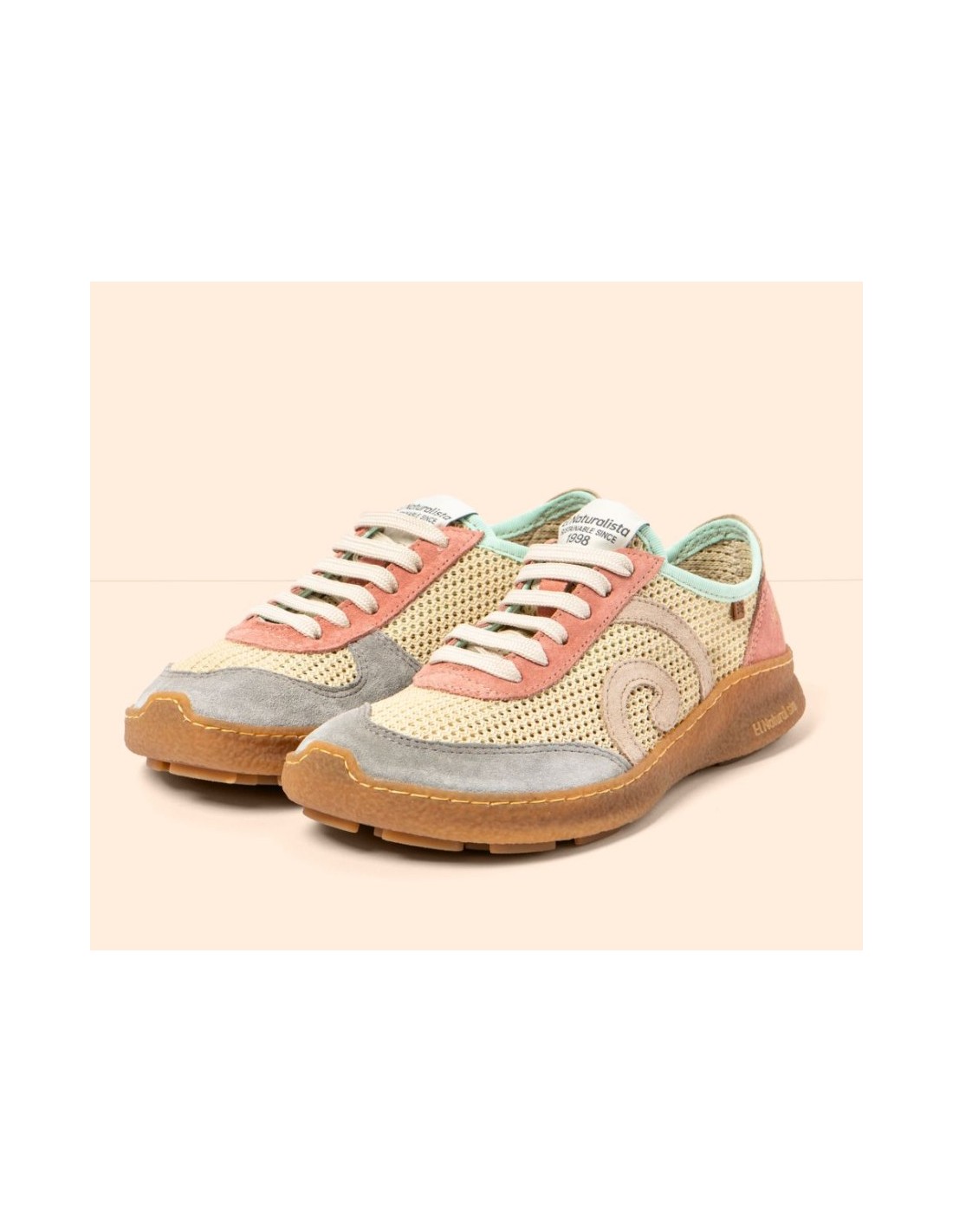 La deportiva El Naturalista N5435C Multi-Material es una fusión equilibrada entre funcionalidad y diseño con carácter. Sus tonos pastel suaves aportan un aire fresco y moderno, ideal para combinar con una gran variedad de estilismos urbanos y casuales. Desde pantalones vaqueros hasta vestidos ligeros, este modelo añade un toque personal y consciente al look diario. Su estética refleja la filosofía de la marca: respeto por el entorno, materiales seleccionados con responsabilidad y un diseño que busca armonía con la naturaleza. El acabado manual en las costuras y el contorno de la suela denotan una atención al detalle que refuerza su autenticidad. Es una deportiva pensada para mujeres activas, que valoran el confort y la durabilidad, sin renunciar al diseño y al compromiso sostenible.